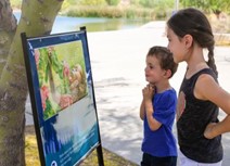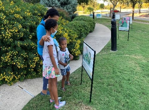 Pages from a children’s picture book are attached to stakes and lined along a path. Families move from page to page, reading as they walk. StoryWalk promotes early literacy, outdoor activity, and family time together in nature.