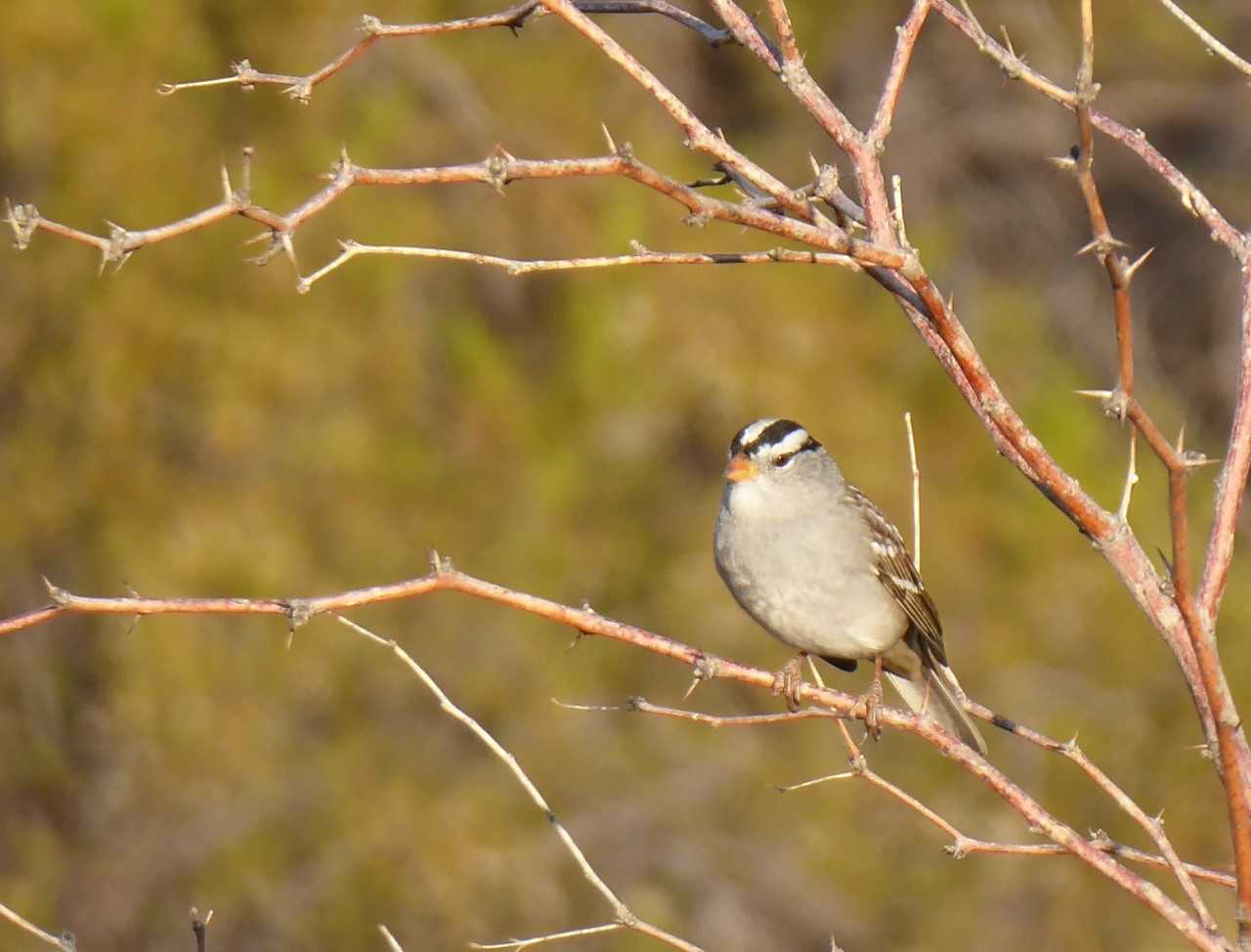 After late summer rains, the grackles found water elsewhere, and the white-winged doves migrated back to Mexico. This left space for mockingbirds and curved-billed thrashers to reassert themselves, and the birdsong became more enjoyable. Abert’s towhees kick dirt among the shrubs and call a sharp note. White-crowned sparrows stop by to snack on winter grass seed. Lizards are rarely seen now, and the little ground snakes have disappeared.