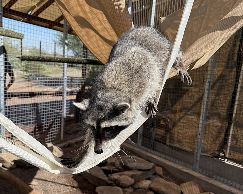 - If you attended Wishes for Wildlife, (and if you come for public hours) you’ll get to see the new mammal enclosures with some new friends inside! Benji the raccoon hangs on a new rope, and Bobby the one-eyed bobcat gives us a quick stare (2 pictures)